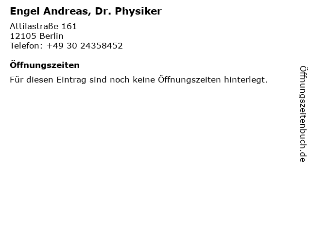 | Öffnungszeiten Engel Andreas, Dr. Physiker in Berlin anzeigen | |