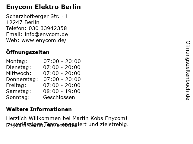 | Öffnungszeiten Enycom Elektro Berlin in Berlin anzeigen | |
