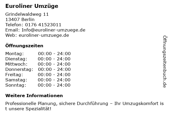 | Öffnungszeiten Euroliner Umzüge in Berlin anzeigen | |