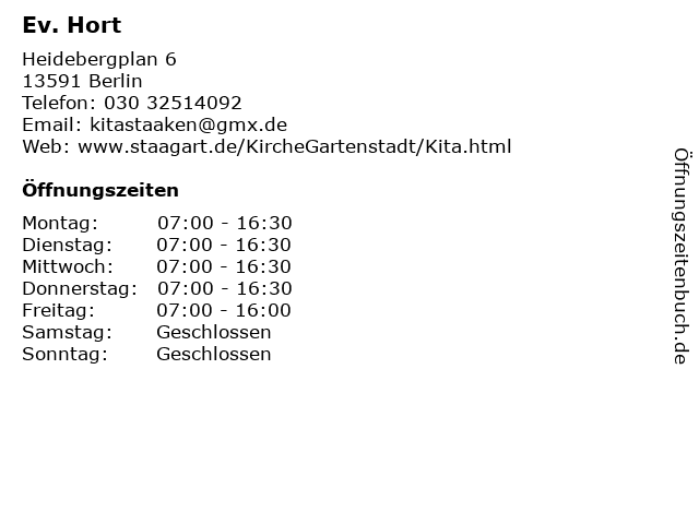 | Öffnungszeiten Ev. Hort in Berlin anzeigen | |