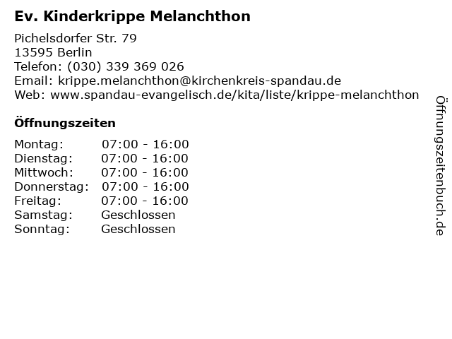 | Öffnungszeiten Ev. Kinderkrippe Melanchthon in Berlin anzeigen | |