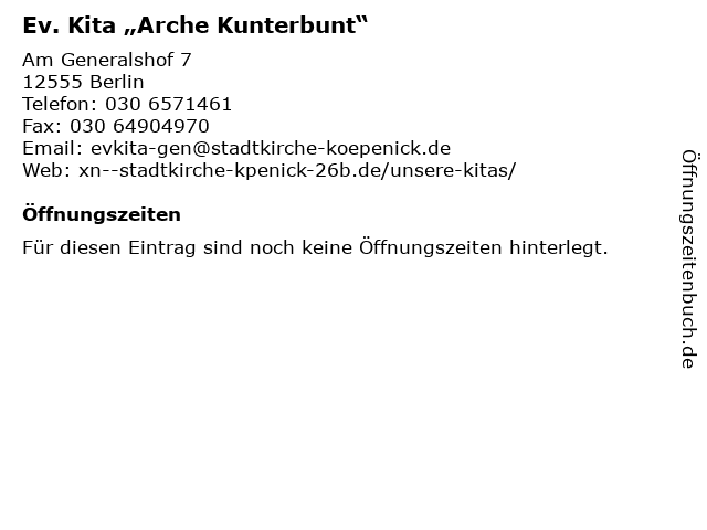 | Öffnungszeiten Ev. Kita „Arche Kunterbunt“ in Berlin anzeigen | |