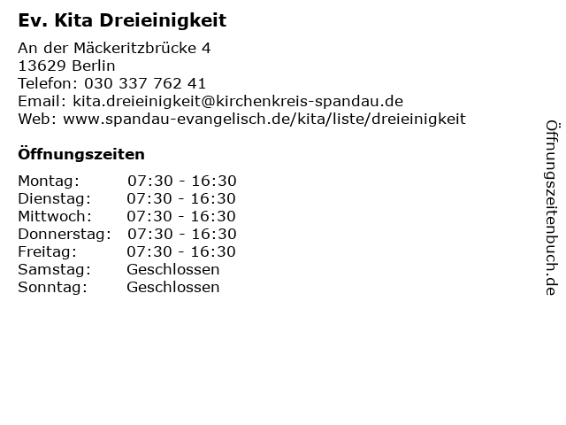 | Öffnungszeiten Ev. Kita Dreieinigkeit in Berlin anzeigen | |