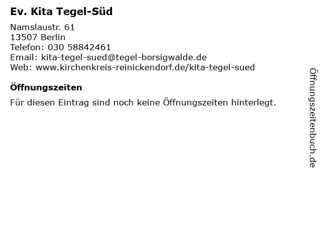 | Öffnungszeiten Ev. Kita Tegel-Süd in Berlin anzeigen | |
