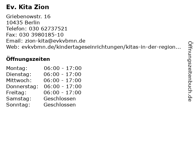 | Öffnungszeiten Ev. Kita Zion in Berlin anzeigen | |