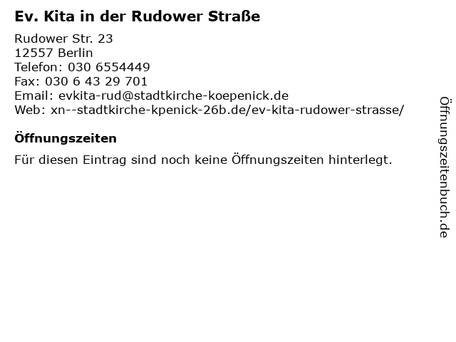 | Öffnungszeiten Ev. Kita in der Rudower Straße in Berlin anzeigen | |