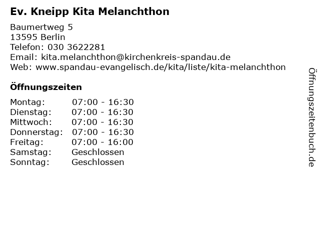 | Öffnungszeiten Ev. Kneipp Kita Melanchthon in Berlin anzeigen | |