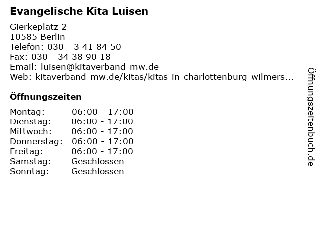 | Öffnungszeiten Evangelische Kita Luisen in Berlin anzeigen | |