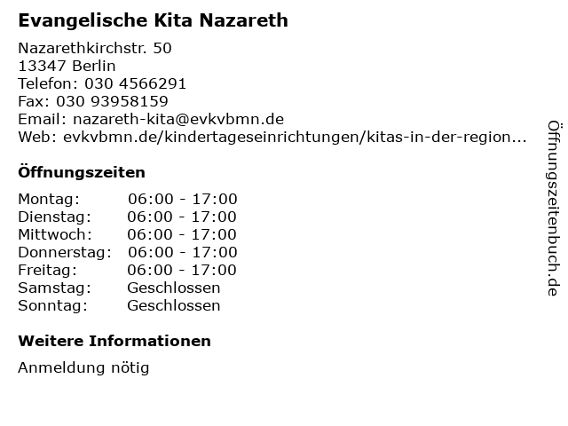 Öffnungszeiten Evangelische Kita Nazareth in Berlin anzeigen | |