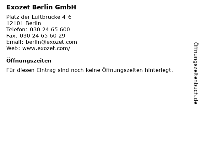 | Öffnungszeiten Exozet Berlin GmbH in Berlin anzeigen | |