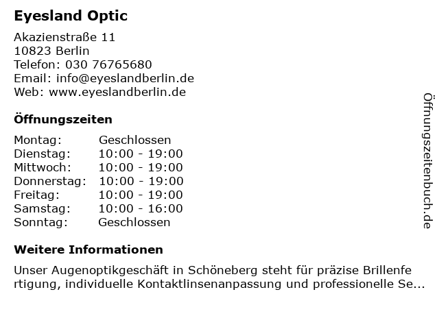| Öffnungszeiten Eyesland Optic in Berlin anzeigen | |