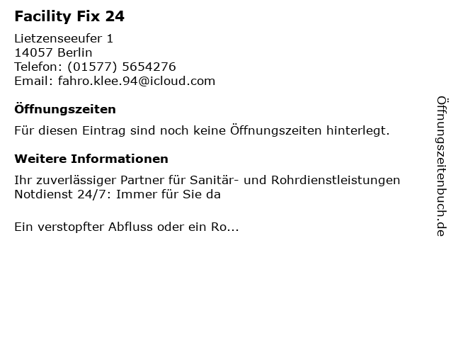 | Öffnungszeiten Facility Fix 24 in Berlin anzeigen | |