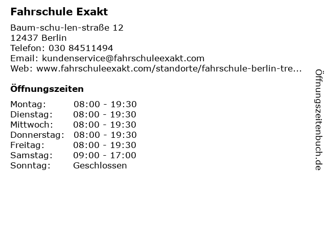| Öffnungszeiten Fahrschule Exakt in Berlin anzeigen | |