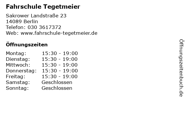 | Öffnungszeiten Fahrschule Tegetmeier in Berlin anzeigen | |