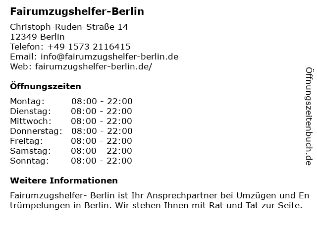 | Öffnungszeiten Fairumzugshelfer-Berlin in Berlin anzeigen | |