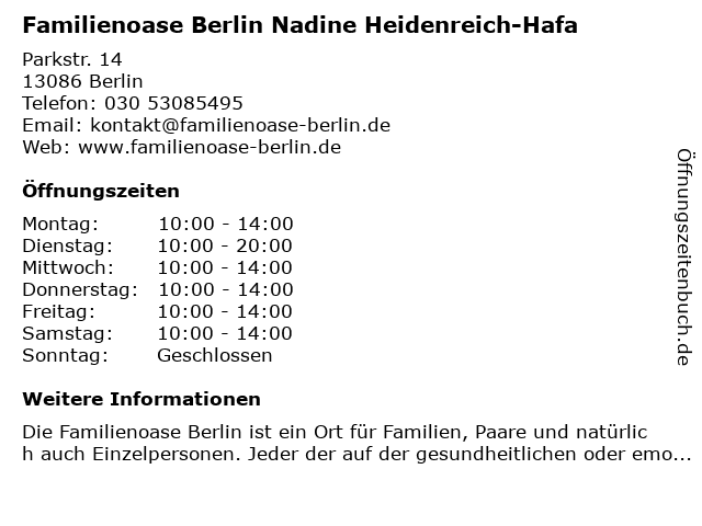 Branchen & Suchbegriffe zu Familienoase Berlin Nadine Heidenreich-Hafa:bestattungsunternehmen, eheberatung, familienoase, gemeinnützige organisation, hafa, heidenreich, lebenscoaching, nadine, psychologie |