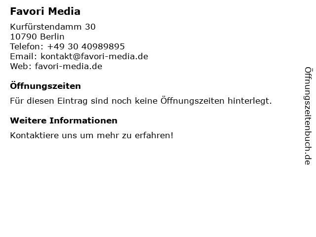 | Öffnungszeiten Favori Media in Berlin anzeigen | |
