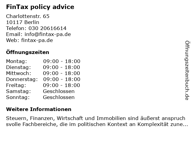| Öffnungszeiten FinTax policy advice in Berlin anzeigen | |
