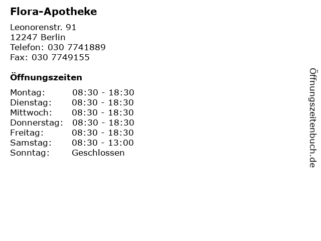 | Öffnungszeiten Flora-Apotheke in Berlin anzeigen | |
