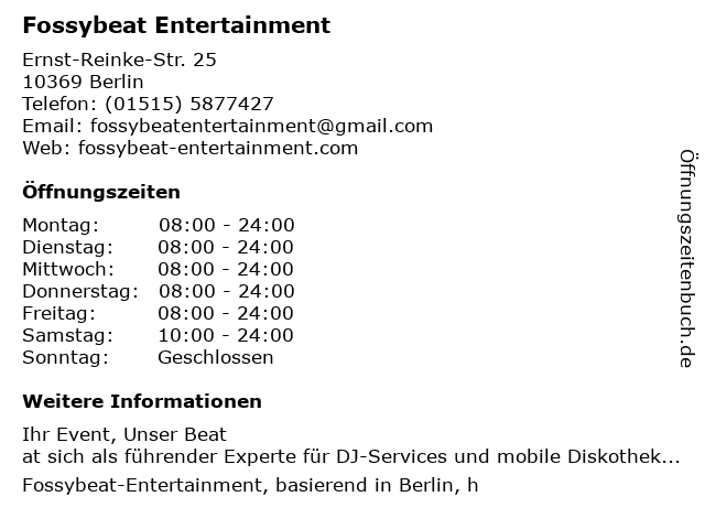 | Öffnungszeiten Fossybeat Entertainment in Berlin anzeigen | |