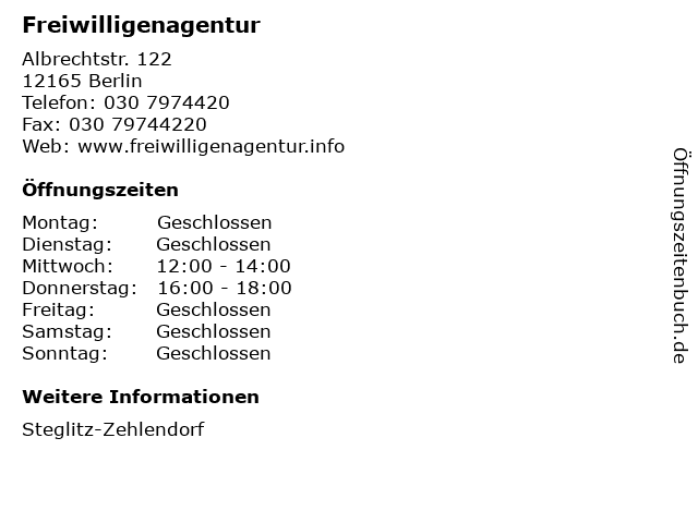 | Öffnungszeiten Freiwilligenagentur in Berlin anzeigen | |