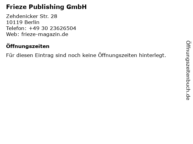 | Öffnungszeiten Frieze Publishing GmbH in Berlin anzeigen | |