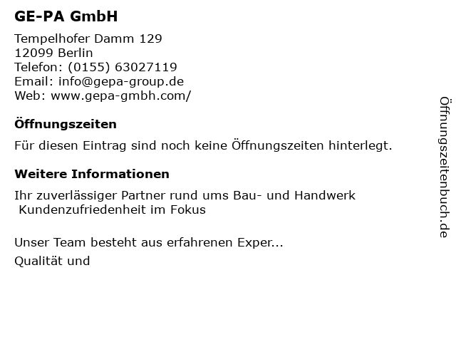 | Öffnungszeiten GE-PA GmbH in Berlin anzeigen | |