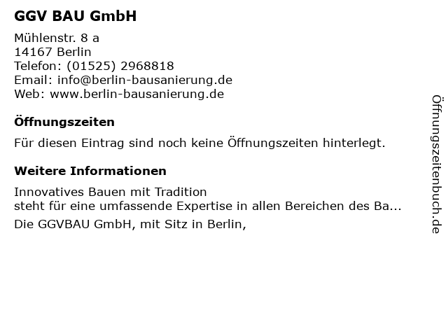 | Öffnungszeiten GGV BAU GmbH in Berlin anzeigen | |