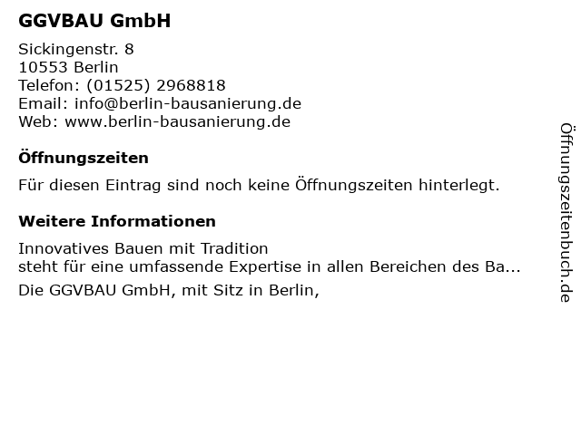 | Öffnungszeiten GGVBAU GmbH in Berlin anzeigen | |