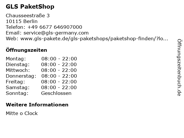 | Öffnungszeiten GLS PaketShop in Berlin anzeigen | |