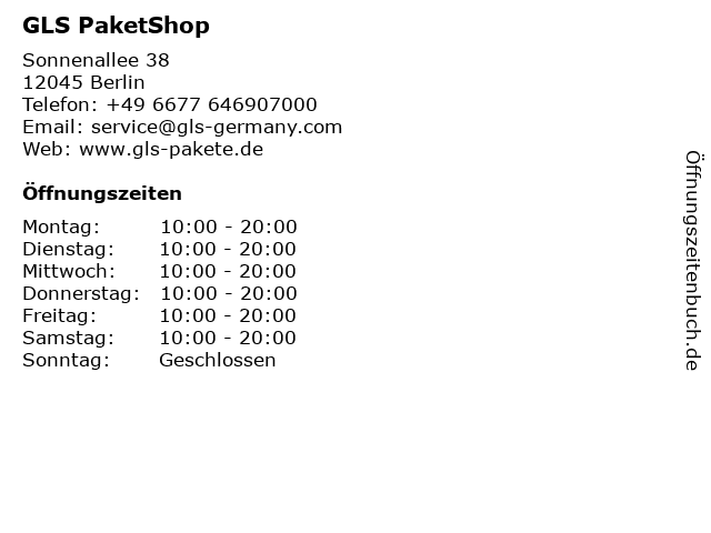 | Öffnungszeiten GLS PaketShop in Berlin anzeigen | |