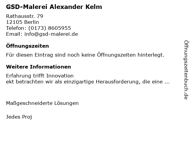 | Öffnungszeiten GSD-Malerei Alexander Kelm in Berlin anzeigen | |