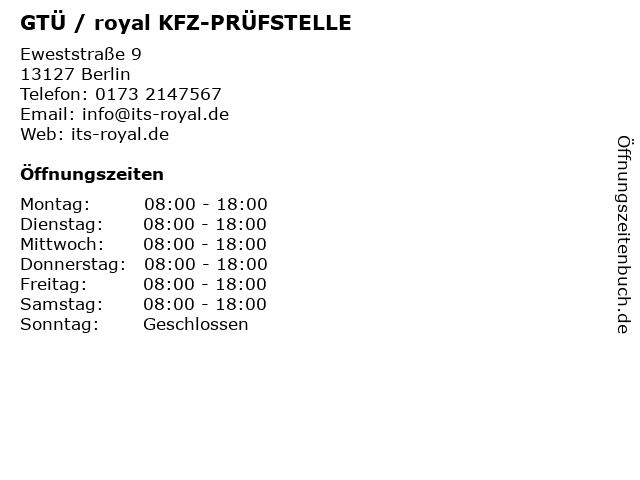 Öffnungszeiten GTÜ / royal KFZ-PRÜFSTELLE in Berlin anzeigen | |