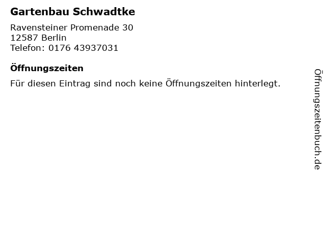 | Öffnungszeiten Gartenbau Schwadtke in Berlin anzeigen | |