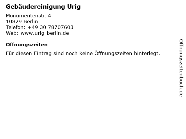 | Öffnungszeiten Gebäudereinigung Urig in Berlin anzeigen | |