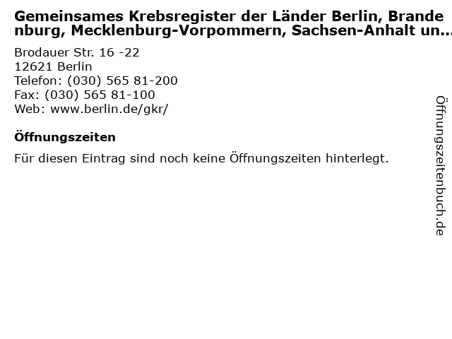 Branchen & Suchbegriffe zu Gemeinsames Krebsregister der Länder Berlin, Brandenburg, Mecklenburg-Vorpommern, Sachsen-Anhalt und der Freistaaten Sachsen und Thüringen:anhalt, bundesländer, freistaaten, gemeinsames, krebsregister, länder, mecklenburg, neuen, sachsen, statistische, thüringen, u., vorpommern, ämter |