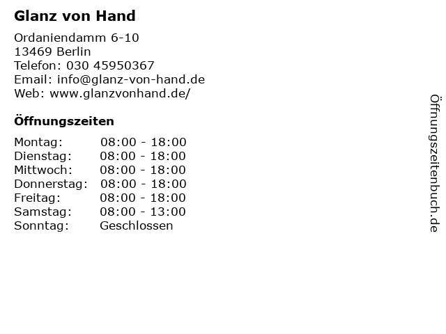 | Öffnungszeiten Glanz von Hand in Berlin anzeigen | |