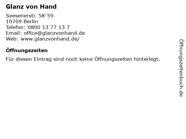 | Öffnungszeiten Glanz von Hand in Berlin anzeigen | |