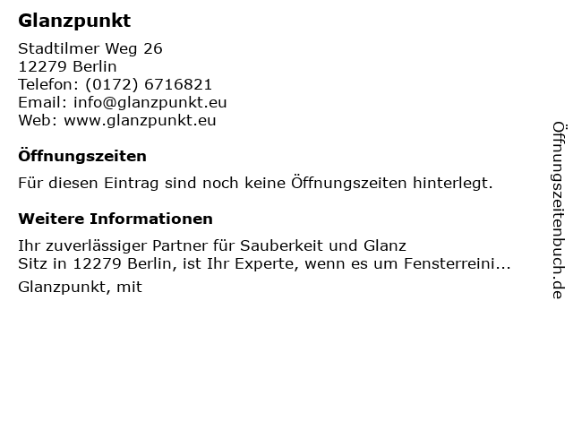 | Öffnungszeiten Glanzpunkt in Berlin anzeigen | |