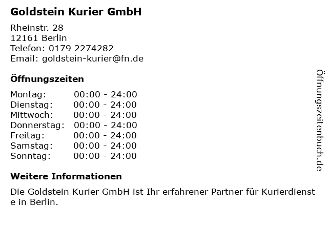 | Öffnungszeiten Goldstein Kurier GmbH in Berlin anzeigen | |