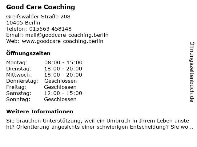 Öffnungszeiten Good Care Coaching in Berlin anzeigen | |