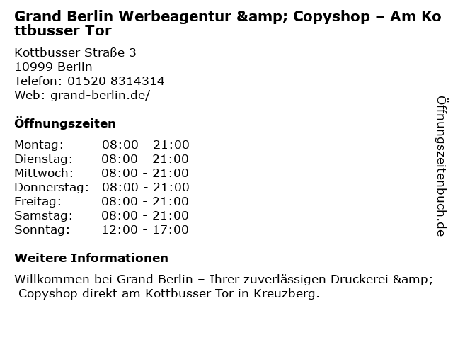 Branchen & Suchbegriffe zu Grand Berlin Werbeagentur & Copyshop – Am Kottbusser Tor:anbieter für aufkleber, anbieter für label, buchbinder, copyshop, druckerei für merchandise-produkte, druckerei für siebdruck, dtp-service, gewerbliche druckerei, grand, kottbusser, schilderladen, tor, werbeagentur, – |