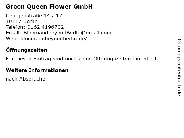 | Öffnungszeiten Green Queen Flower GmbH in Berlin anzeigen | |