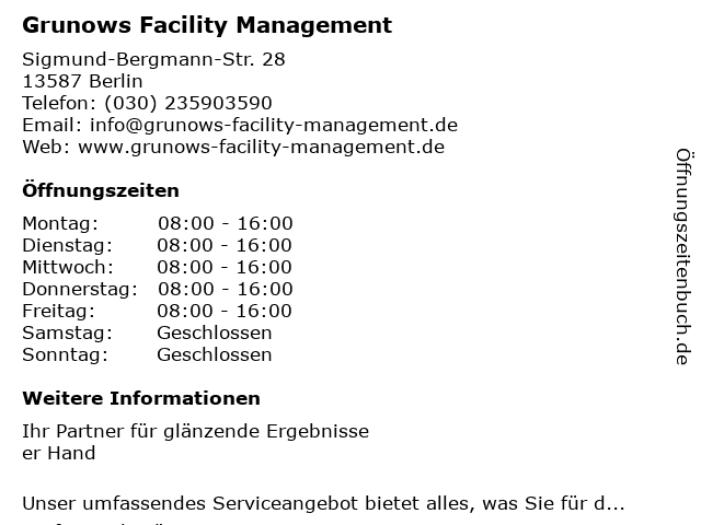 | Öffnungszeiten Grunows Facility Management in Berlin anzeigen | |