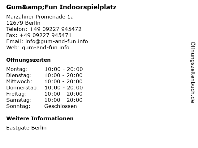 | Öffnungszeiten Gum&Fun Indoorspielplatz in Berlin anzeigen | |