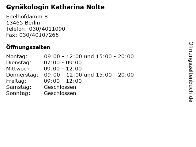 | Öffnungszeiten Gynäkologin Katharina Nolte in Berlin anzeigen | |