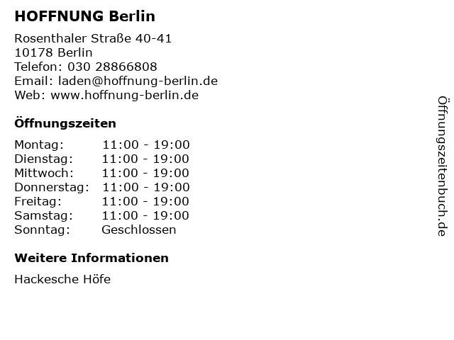 | Öffnungszeiten HOFFNUNG Berlin in Berlin anzeigen | |