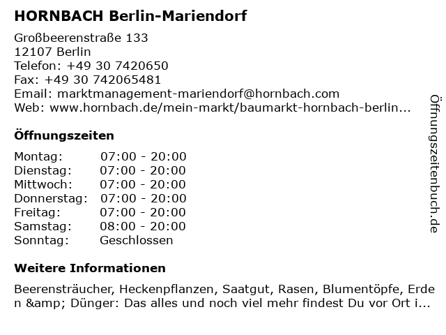 | Öffnungszeiten HORNBACH Berlin-Mariendorf in Berlin anzeigen | |