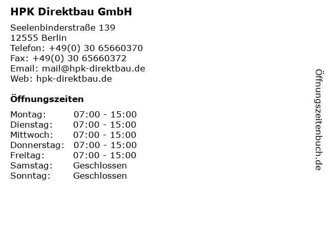 | Öffnungszeiten HPK Direktbau GmbH in Berlin anzeigen | |
