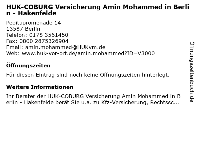 | HUK-COBURG Versicherung Amin Mohammed in Berlin - Hakenfelde anrufen | |